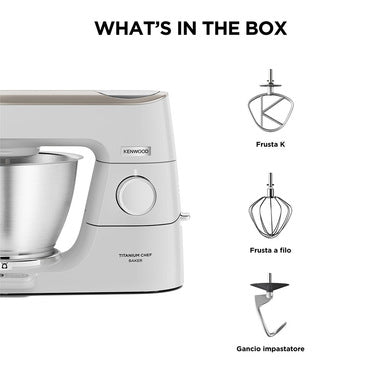 Titanium Chef Baker, la tua impastatrice che PESA. Finitura Silver, Motore 1200W, movimento planetario, ciotola capiente da 5L, bilancia integrata, schermo LCD con timer, utensili per la miscelazione in alluminio che includono: frusta K, frusta a filo, gancio impastatore. Cover PopTop™ opzionali intercambiabili.